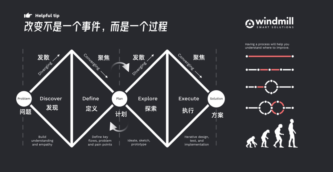 有一个很好的设计方法,就是大家耳熟能详的“双钻模型”。它需要设计师经历四个主要阶段,才能从问题中找到解决方案: