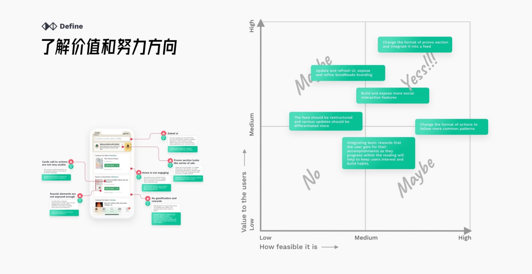 列出问题和解决方法的想法是一件好事,但是需要考虑需求的优先级,了解什么是容易实现的需求。对于每一个机会,我们都需要了解交付它需要什么,以及我们能为最终用户增加多少价值。理想情况下,我们希望关注下图的右上象限。