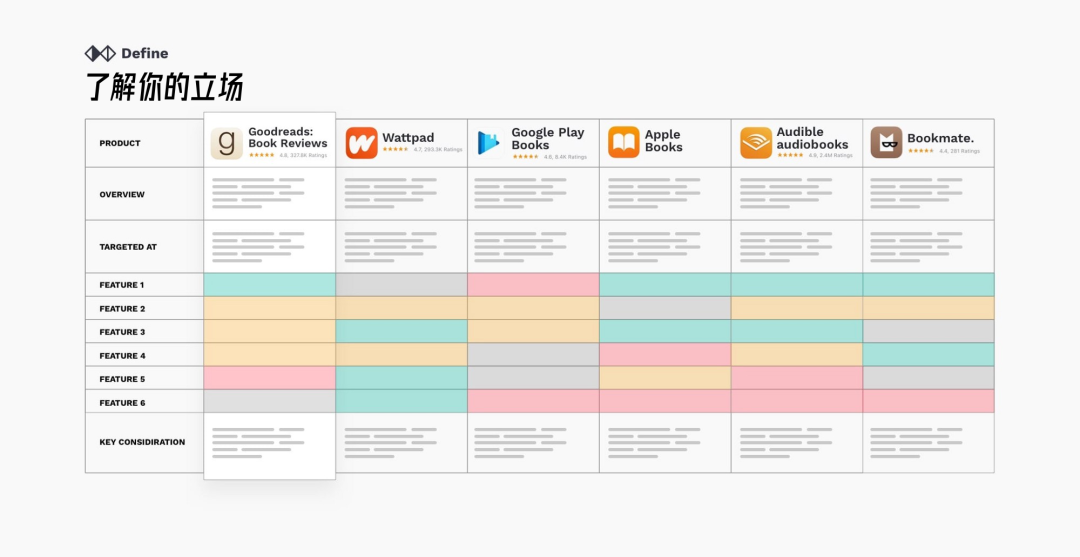 竞品分析可以帮助你找到市场上的机会点。如果你有更多时间,还可以创建一个简单的矩阵,列出有关竞品的核心信息。了解每种竞品的目标、功能的特点,盈利模型和市场占有率。将这些与你的产品进行比较,可以让你对自己所处的位置有一个高层次的了解。